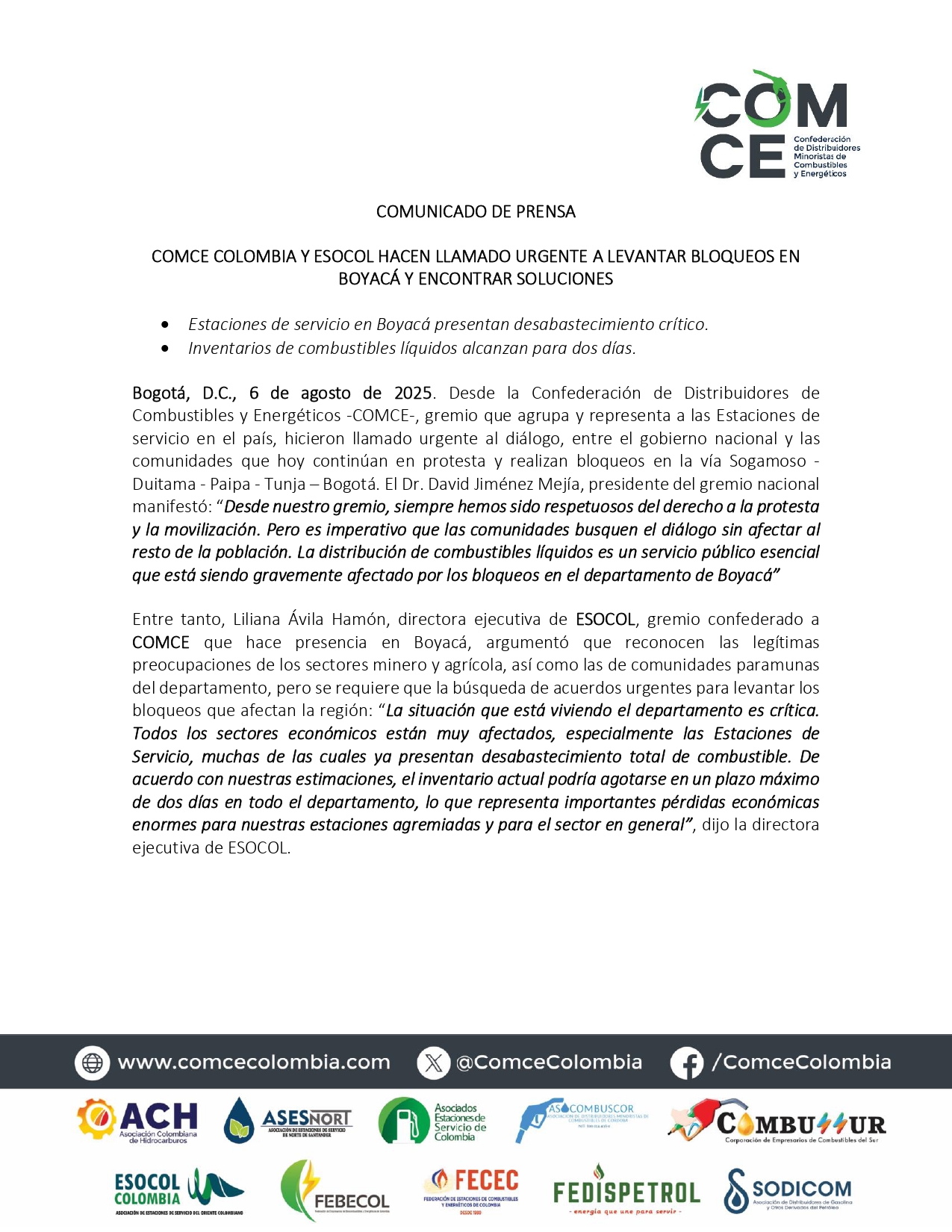 COMCE y ESOCOL Colombia hacen un llamado urgente a levantar bloqueos en Boyacá y encontrar soluciones. agosto 6, 2025 COMCE y ESOCOL Colombia hacen un llamado urgente a levantar bloqueos en Boyacá y encontrar soluciones. Leer más »